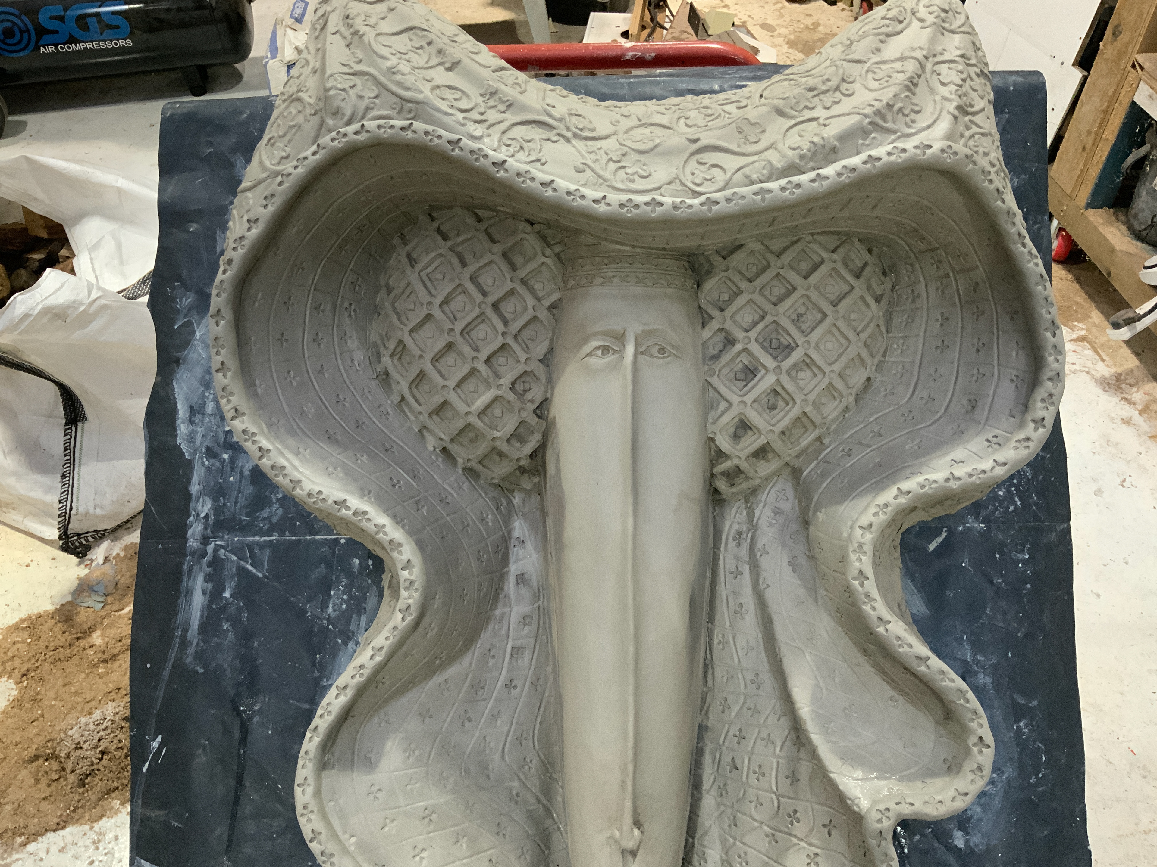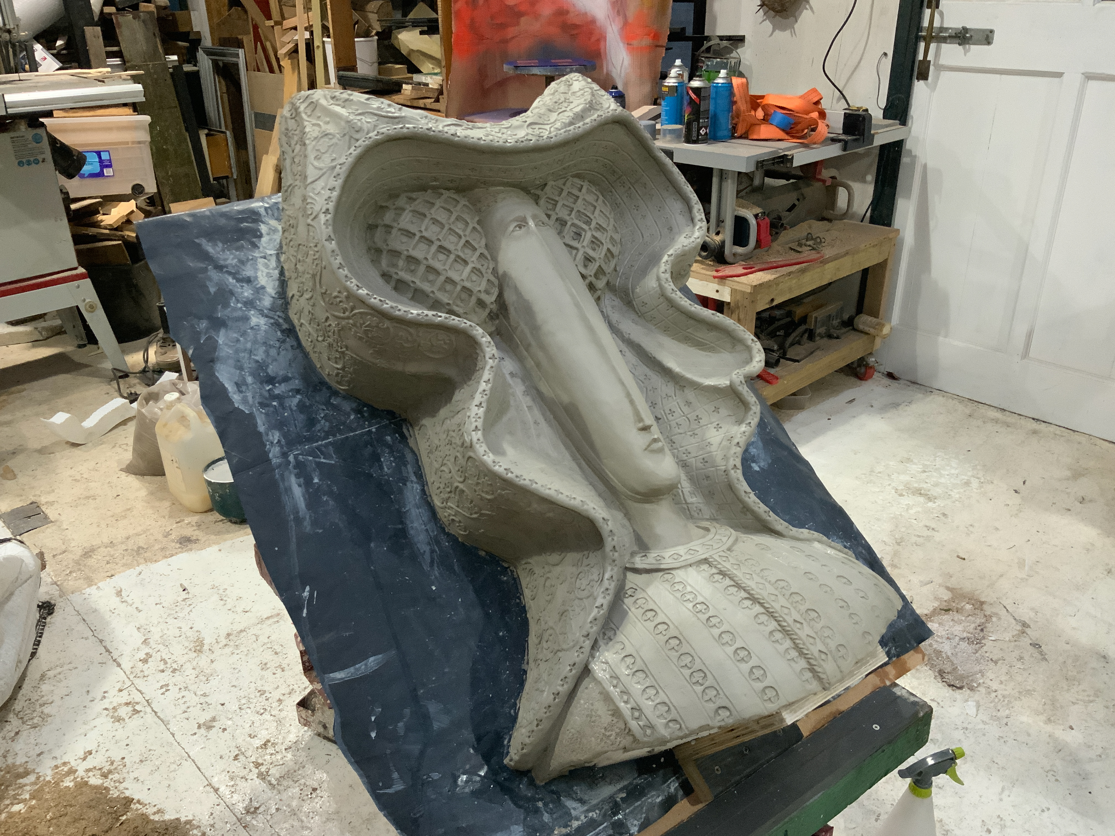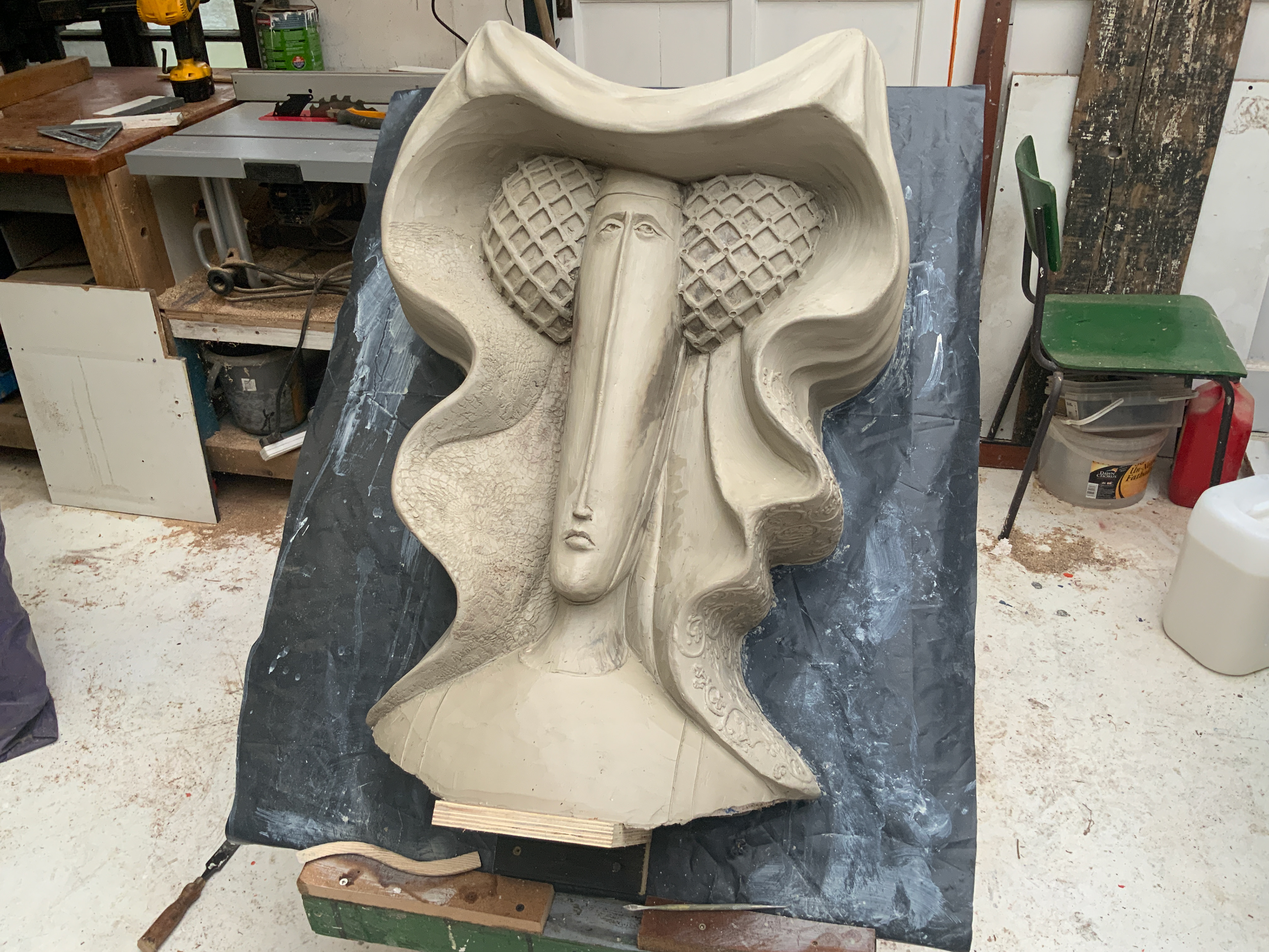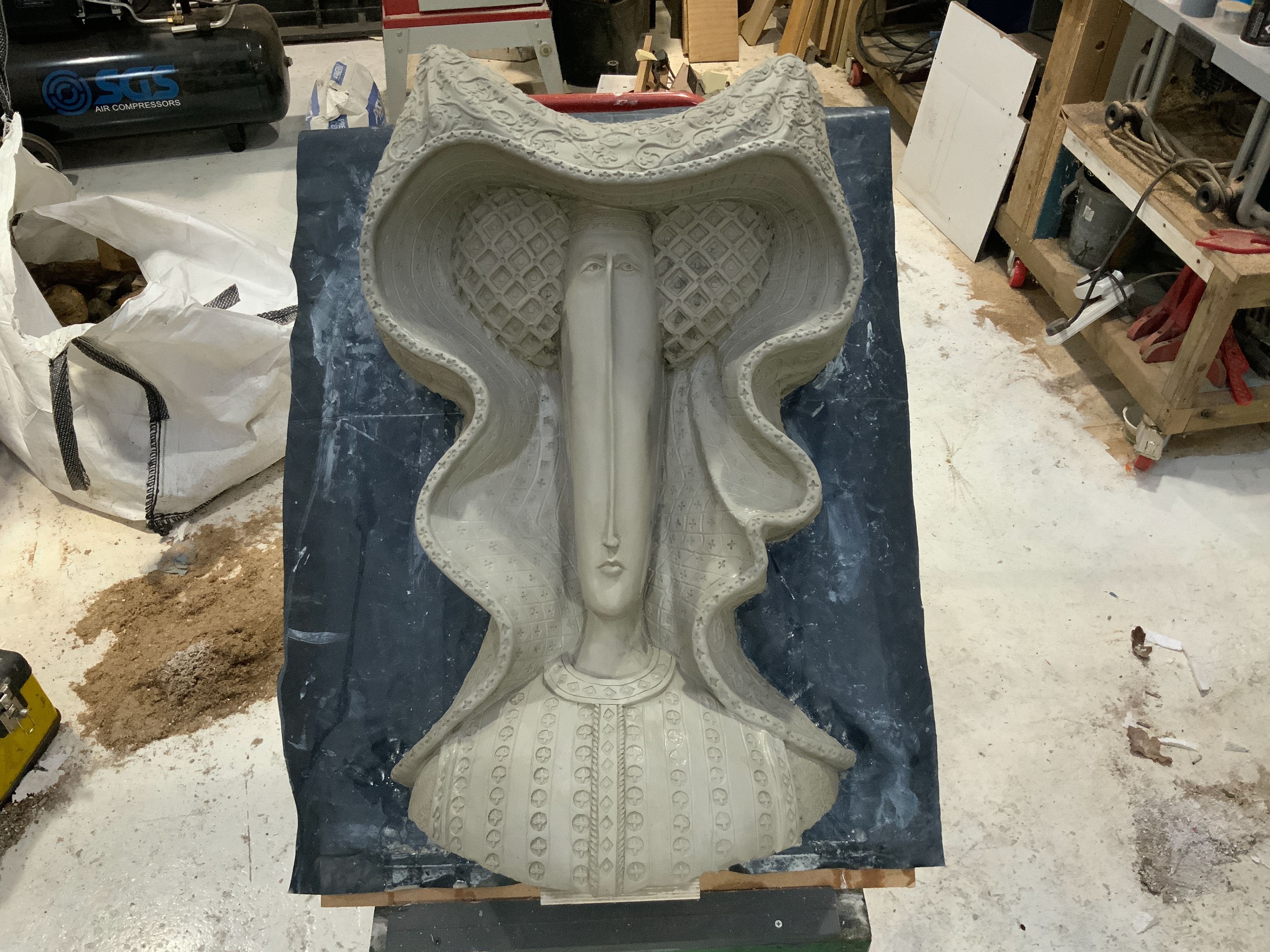 Commissioned by CADW in 2024 this stylised portrait of Eleanor de Clare was modelled in clay and cast in bronze effect jesmonite resin with gold leaf detailing. Installed inside Caerphilly castle, it replaces the previous portrait of Gilbert de Clare and is joined by previous portraits of Hugh le despencer, King Edward the 2nd and Isabella De Clare.