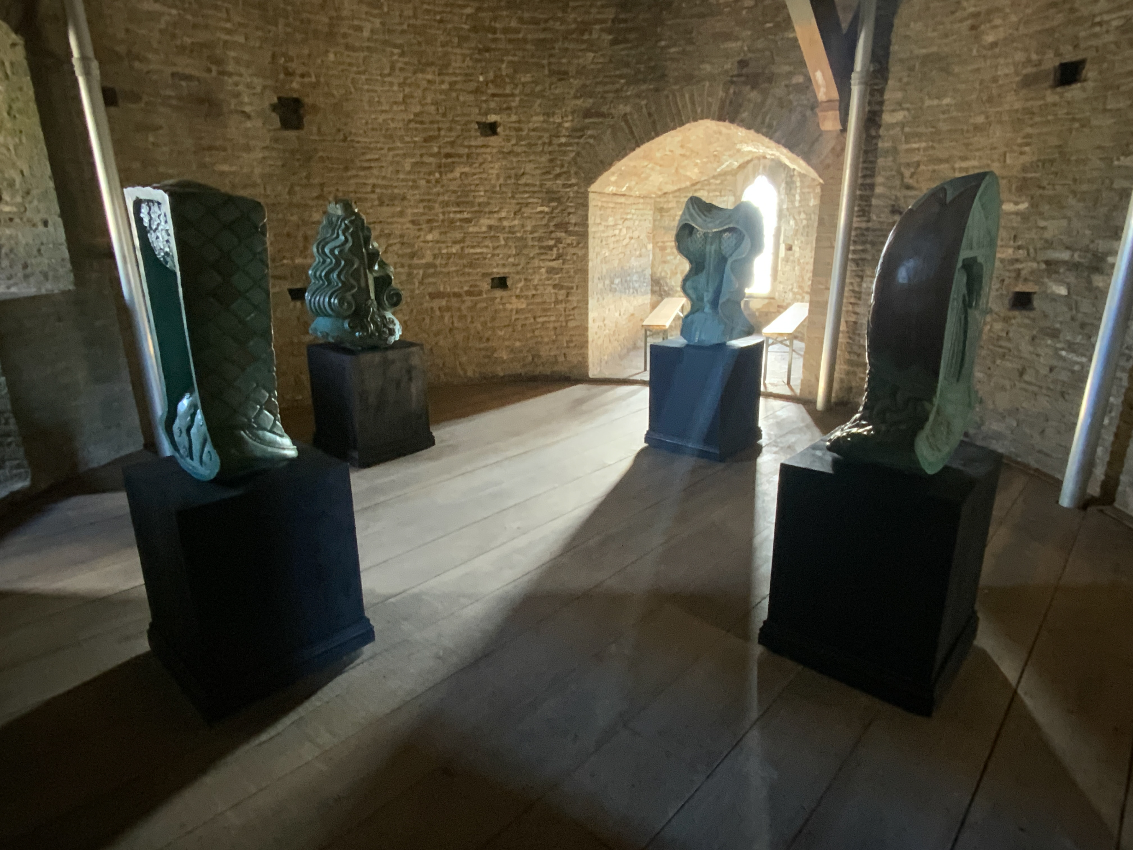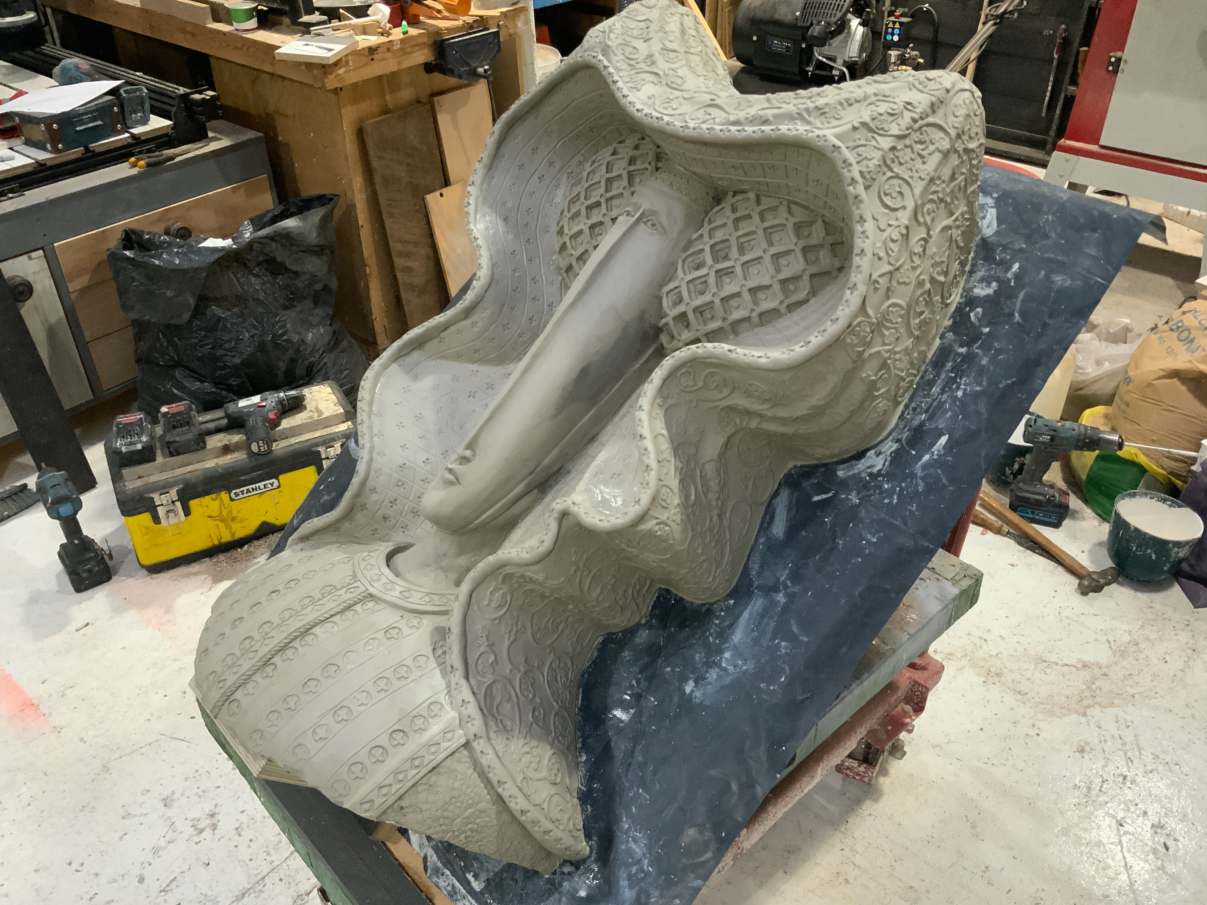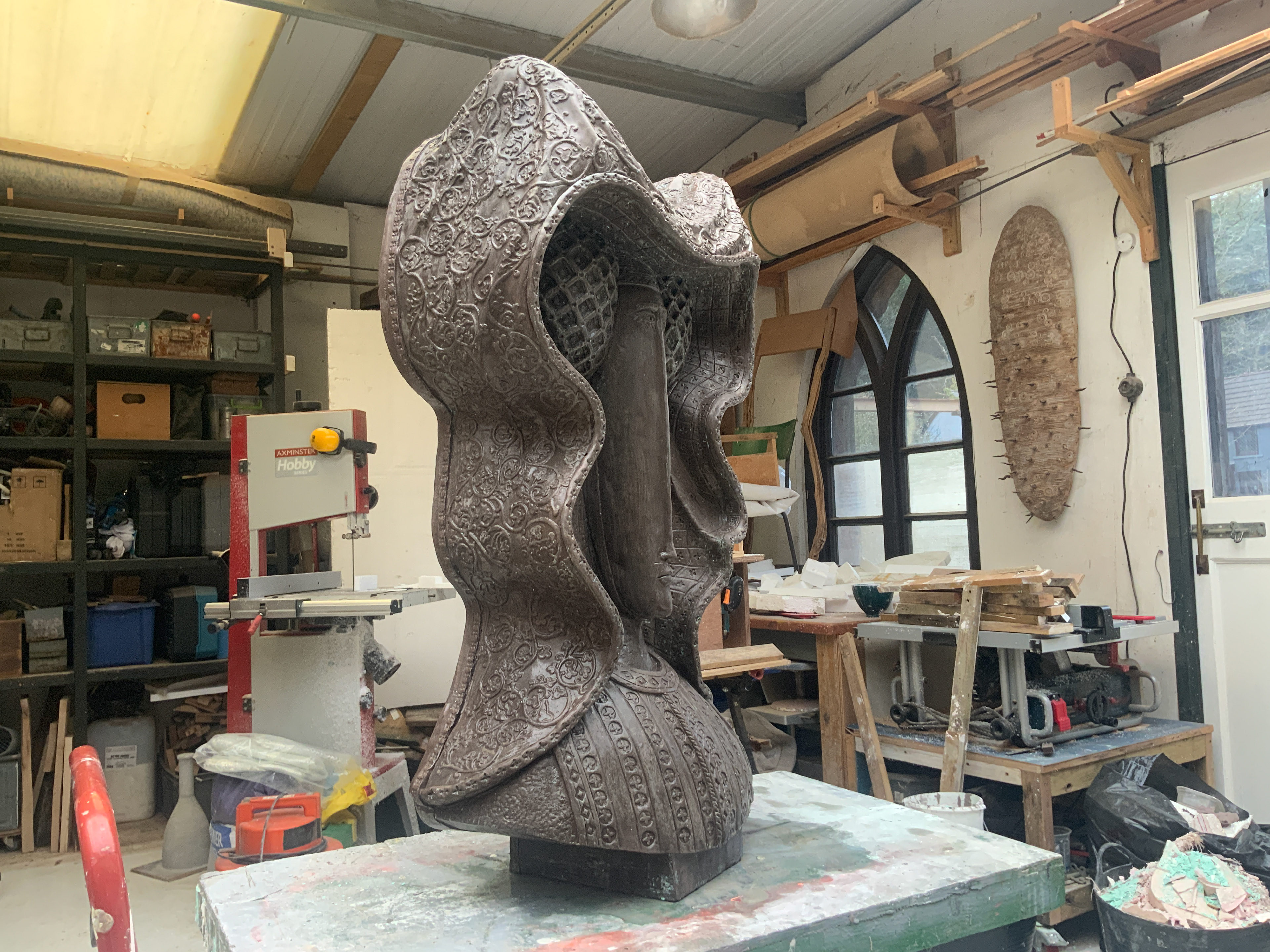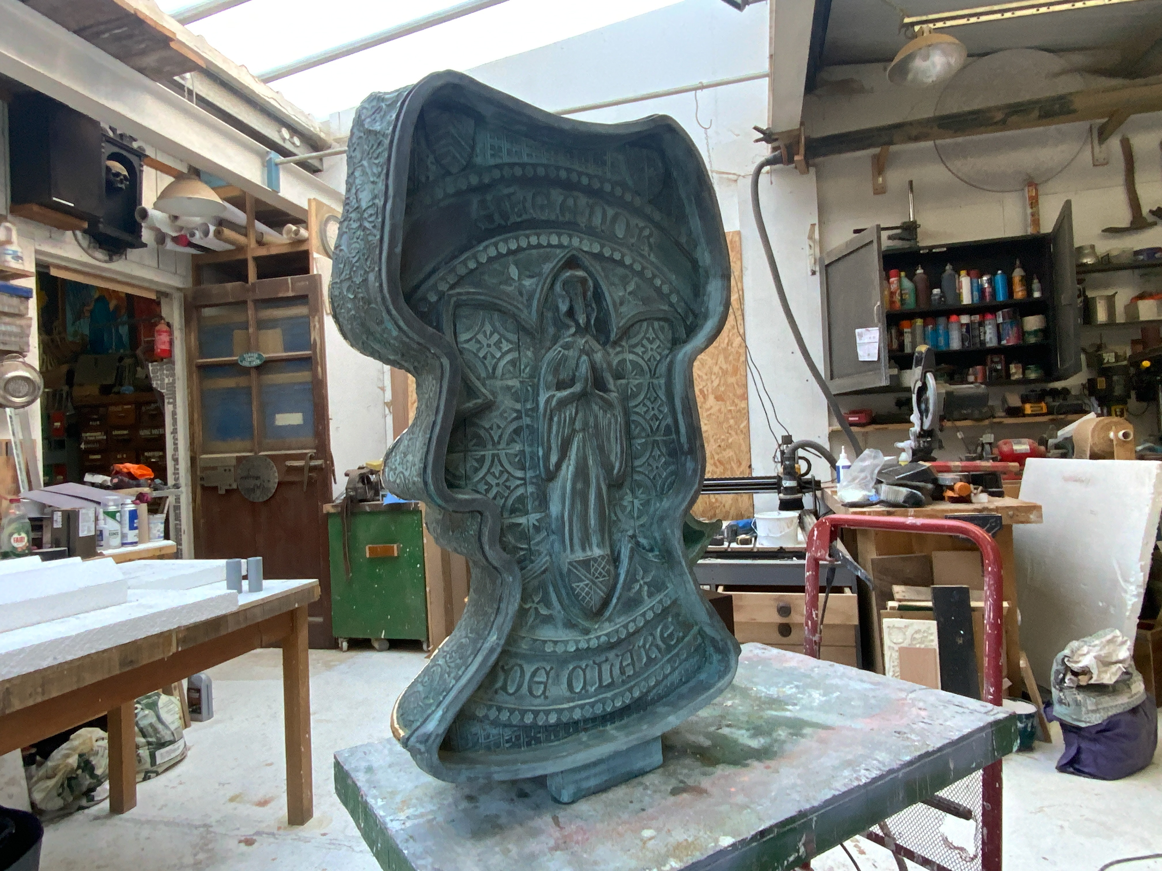 Commissioned by CADW in 2024 this stylised portrait of Eleanor de Clare was modelled in clay and cast in bronze effect jesmonite resin with gold leaf detailing. Installed inside Caerphilly castle, it replaces the previous portrait of Gilbert de Clare and is joined by previous portraits of Hugh le despencer, King Edward the 2nd and Isabella De Clare.