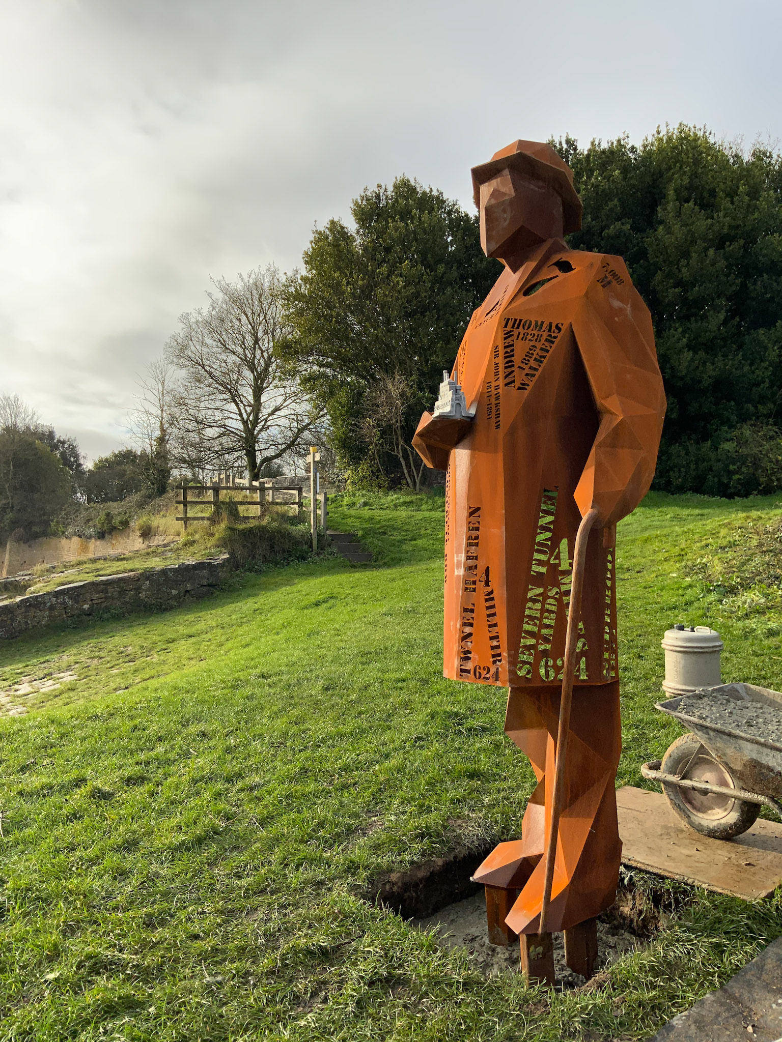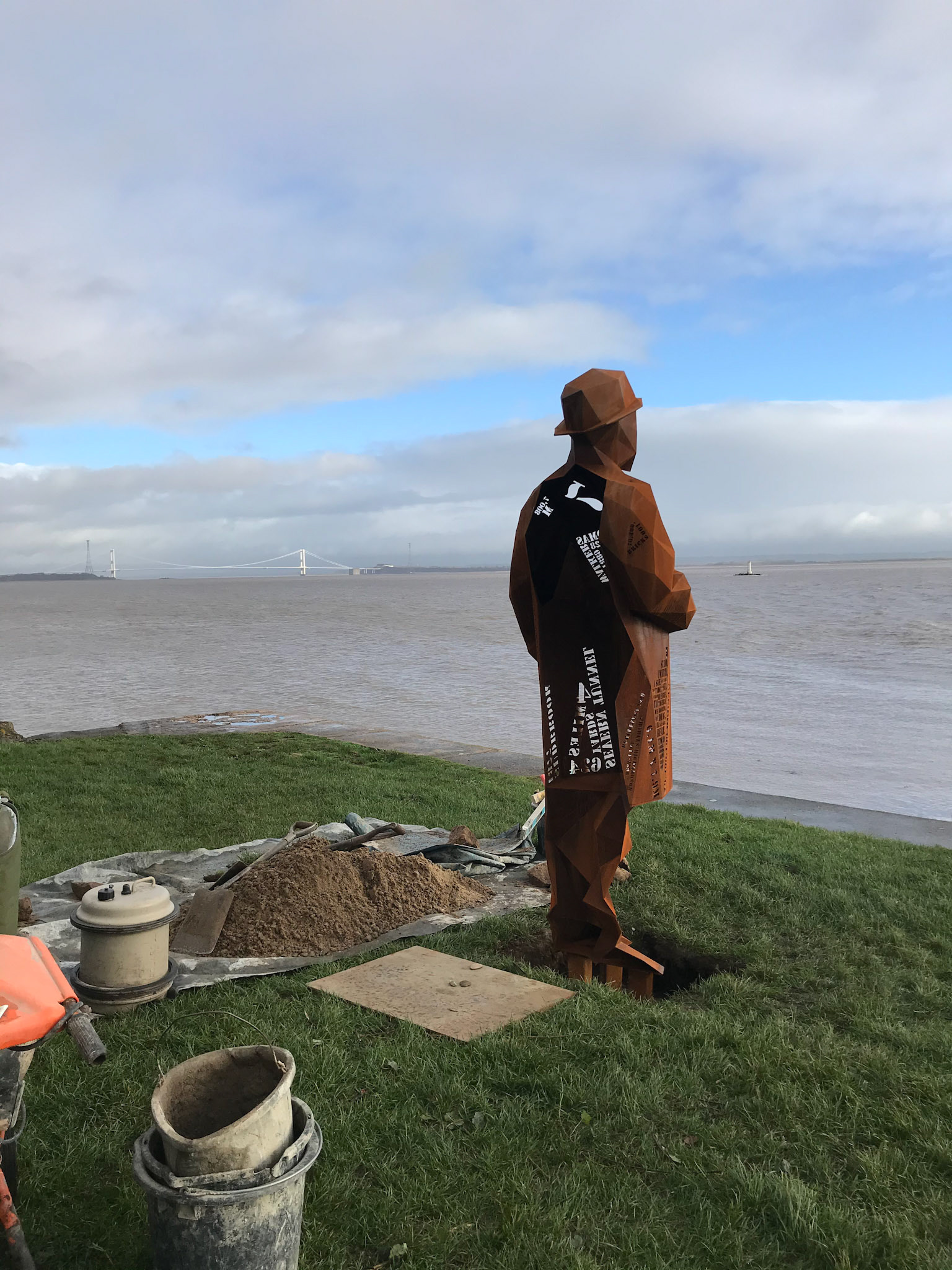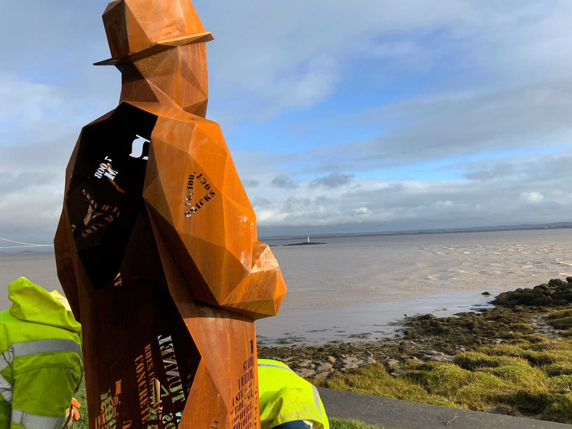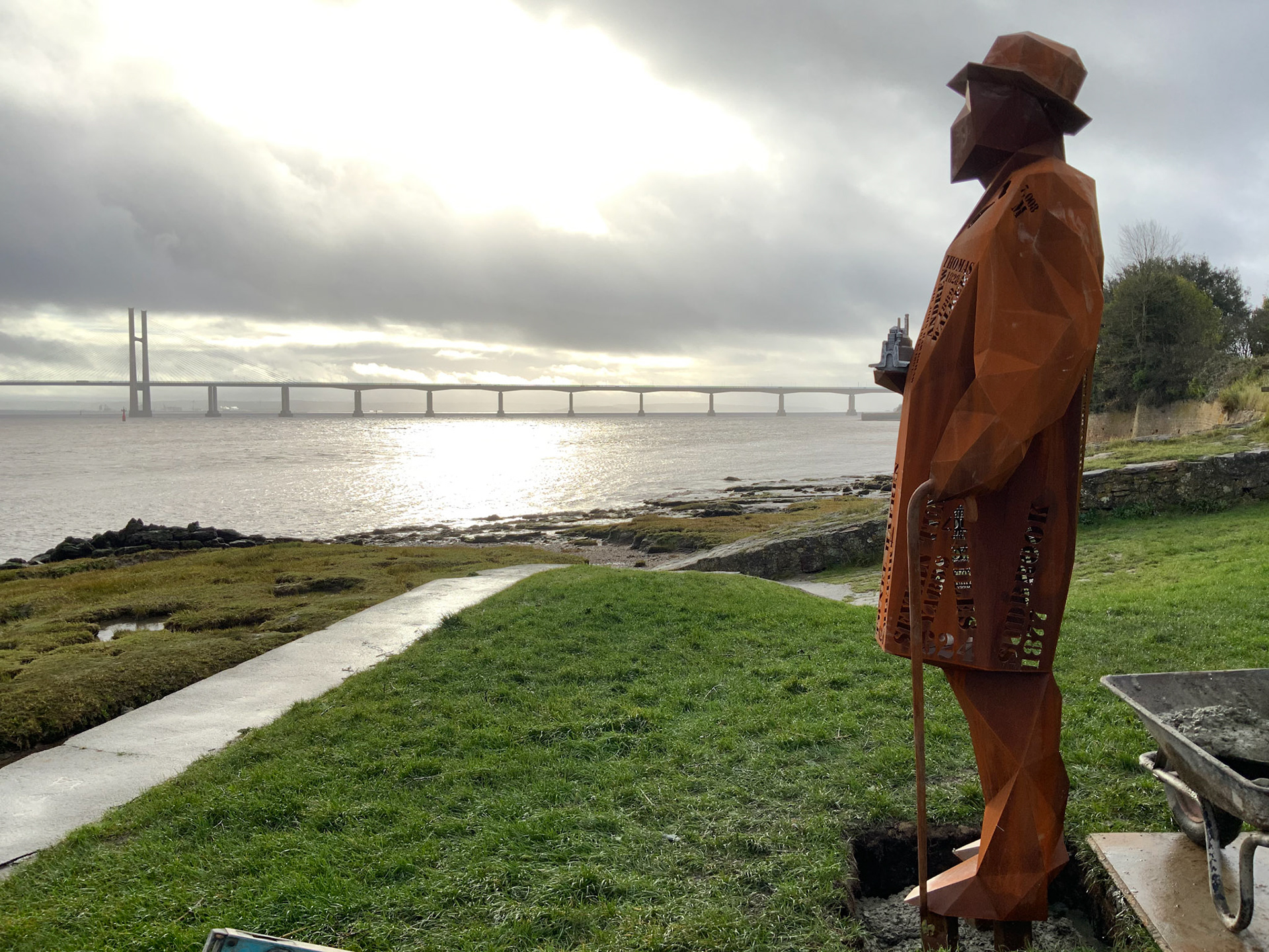 Commissioned by Living Levels ( https://www.livinglevels.org.uk ) this 2.4m tall fabricated Corten sculpture titled, 'The Engineer' represents Thomas Walker, who was the civil engineer that completed the Severn tunnel and founded the hamlet of Sudbrook. Installed in 2021 the sculpture stands between the two Severn bridges at Blackrock picnic site overlooking the river.