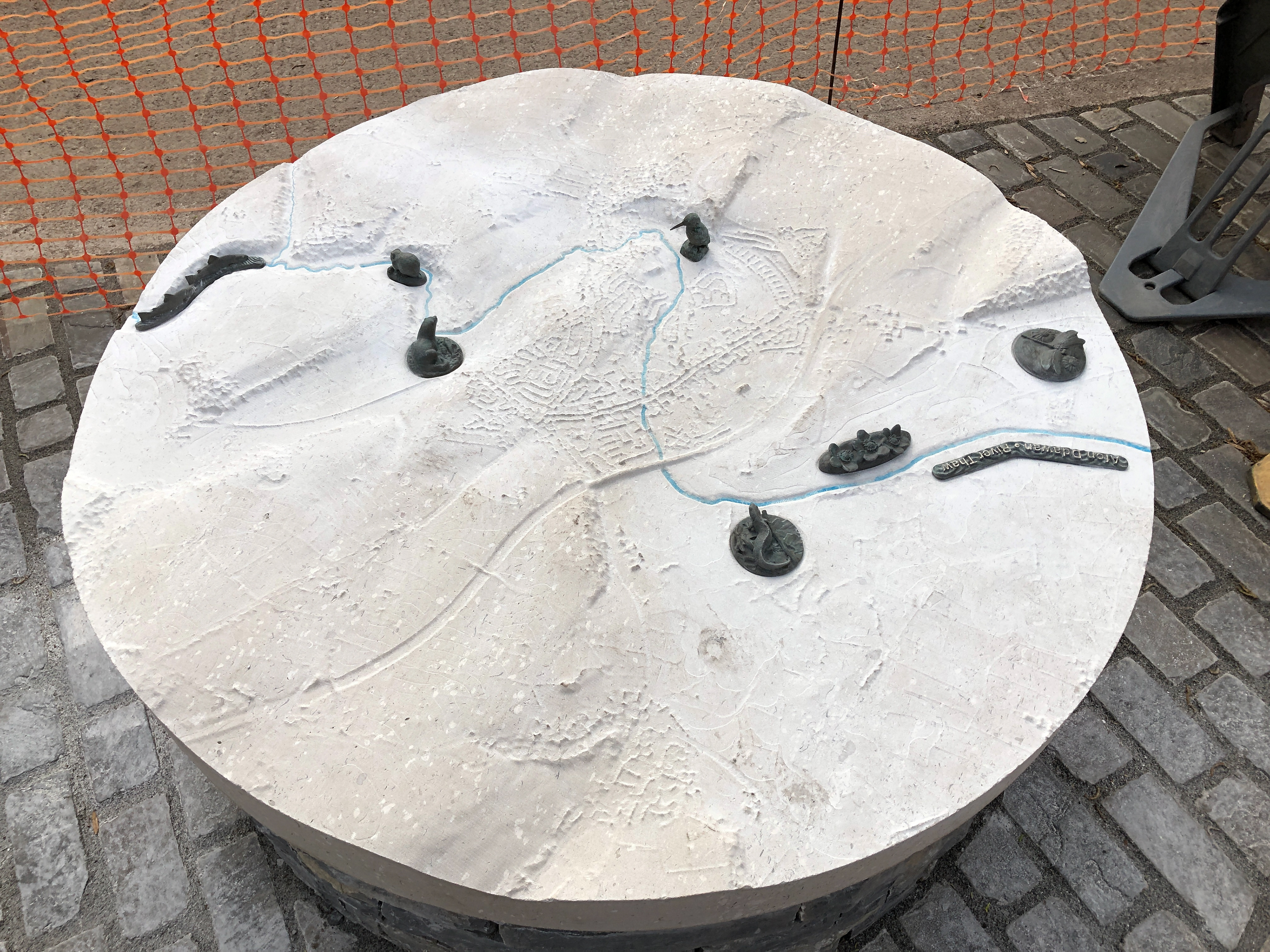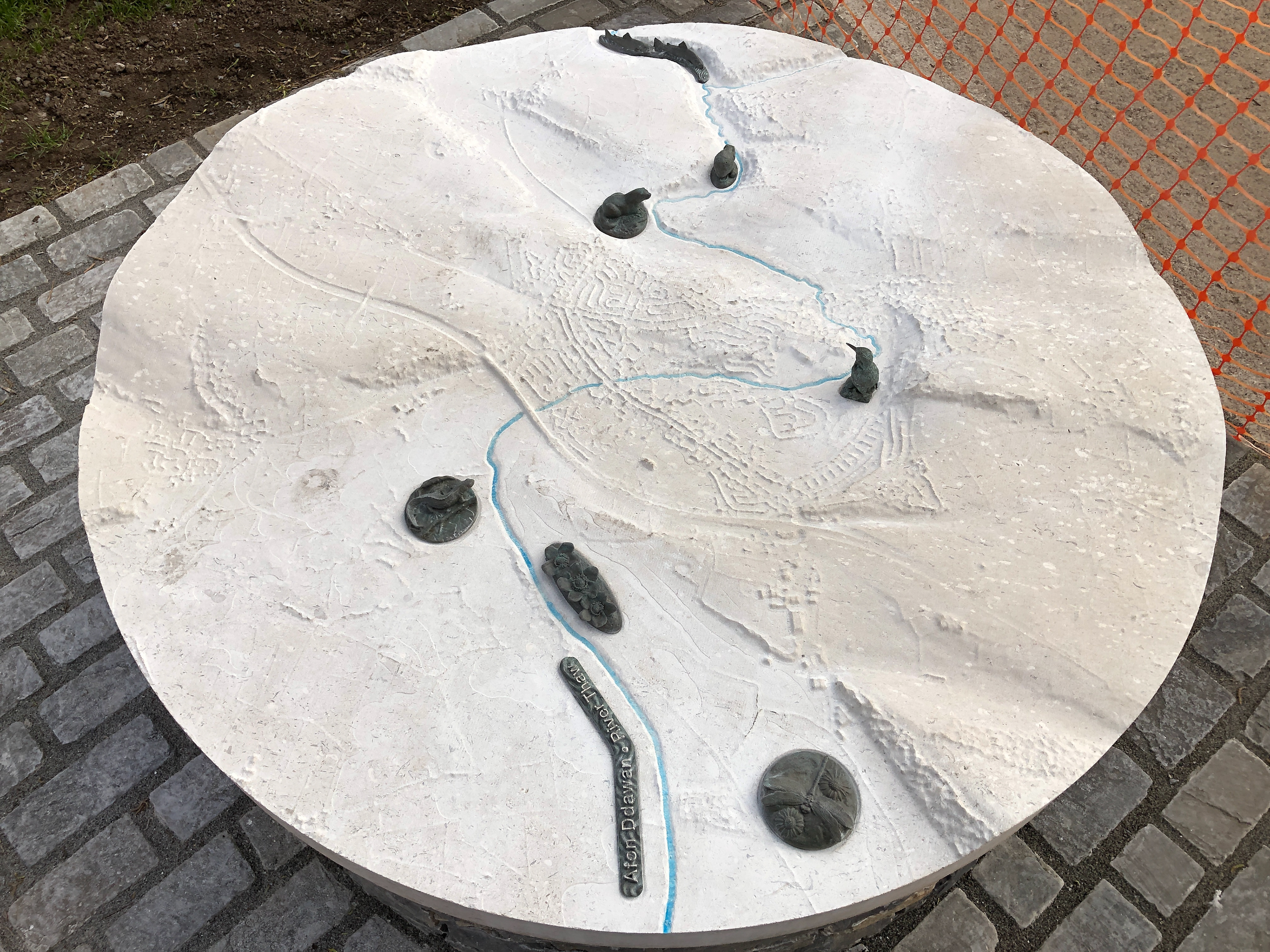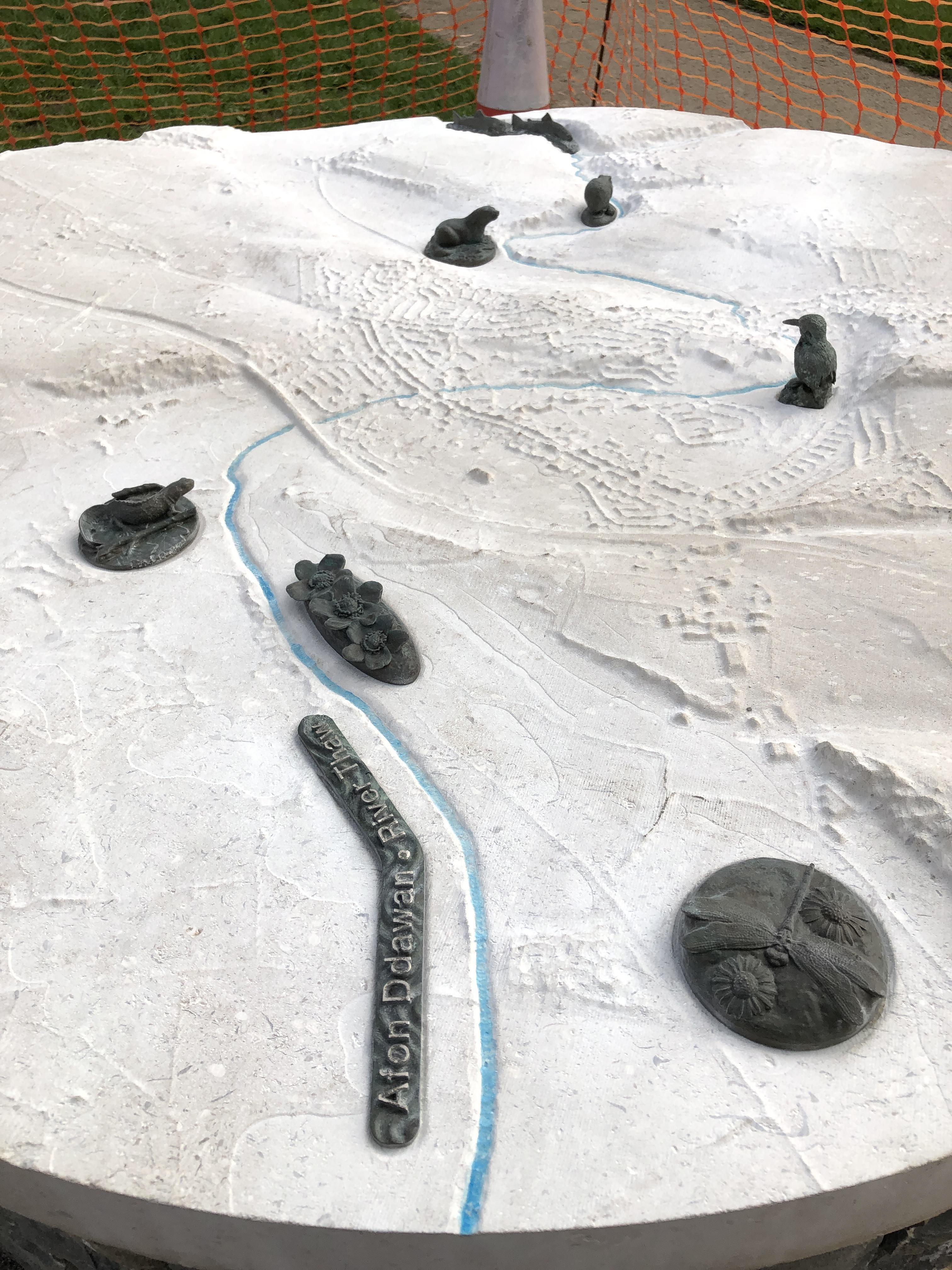 Commissioned by the Vale of Glamorgan county Council this 1.5m diameter 3D map was produced to highlight the work carried out by the Restore the Thaw Landscape project. The map shows the route of the river Thaw through Cowbridge town and the surrounding landscape and set along it are a series of bronzes reflecting local flora and fauna.
