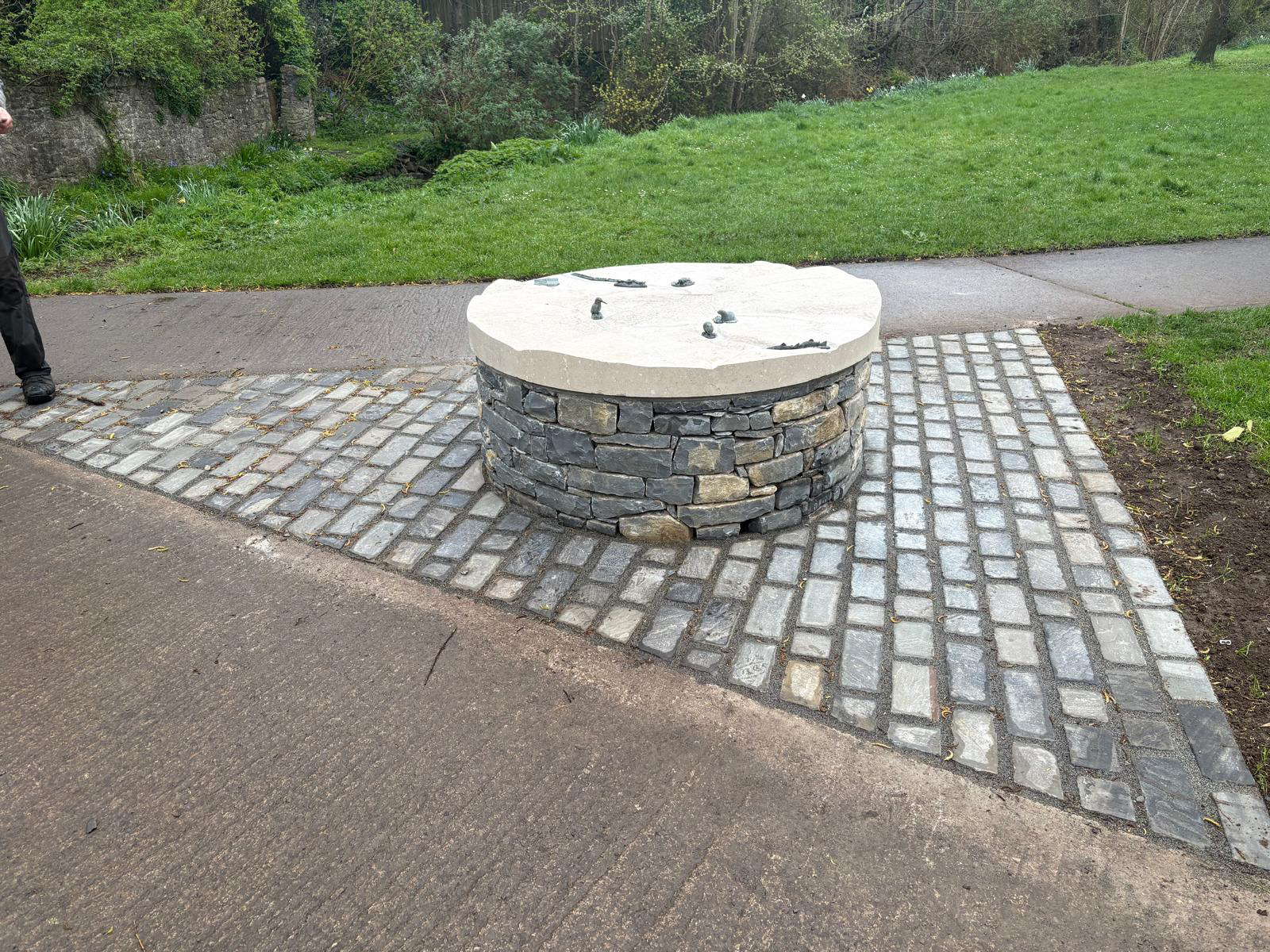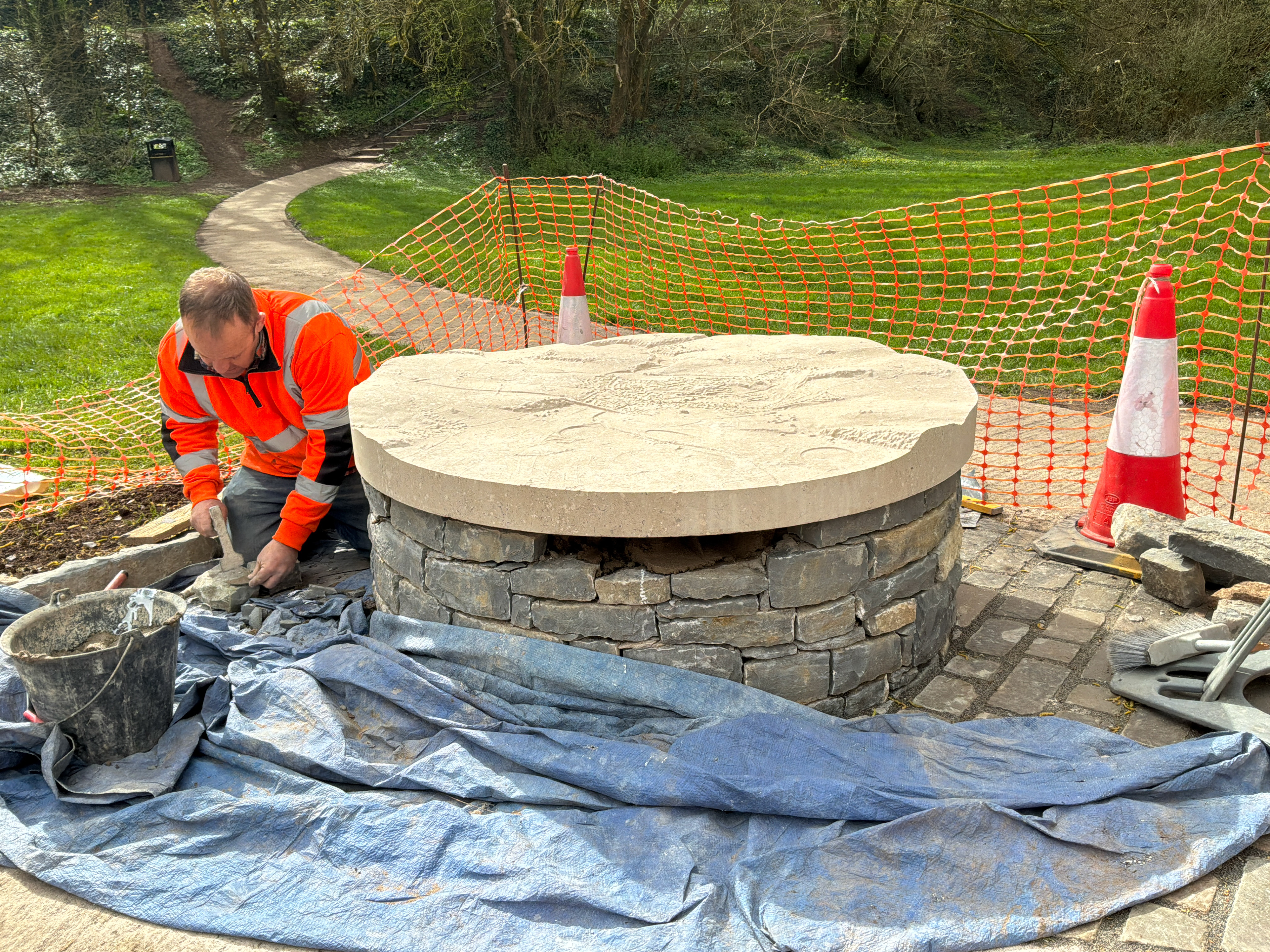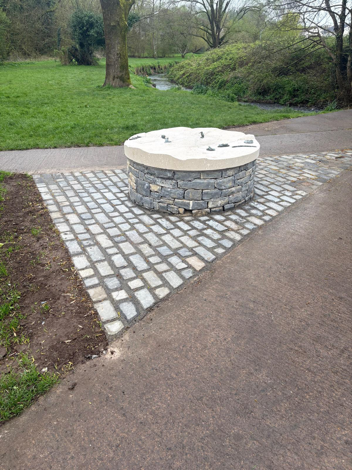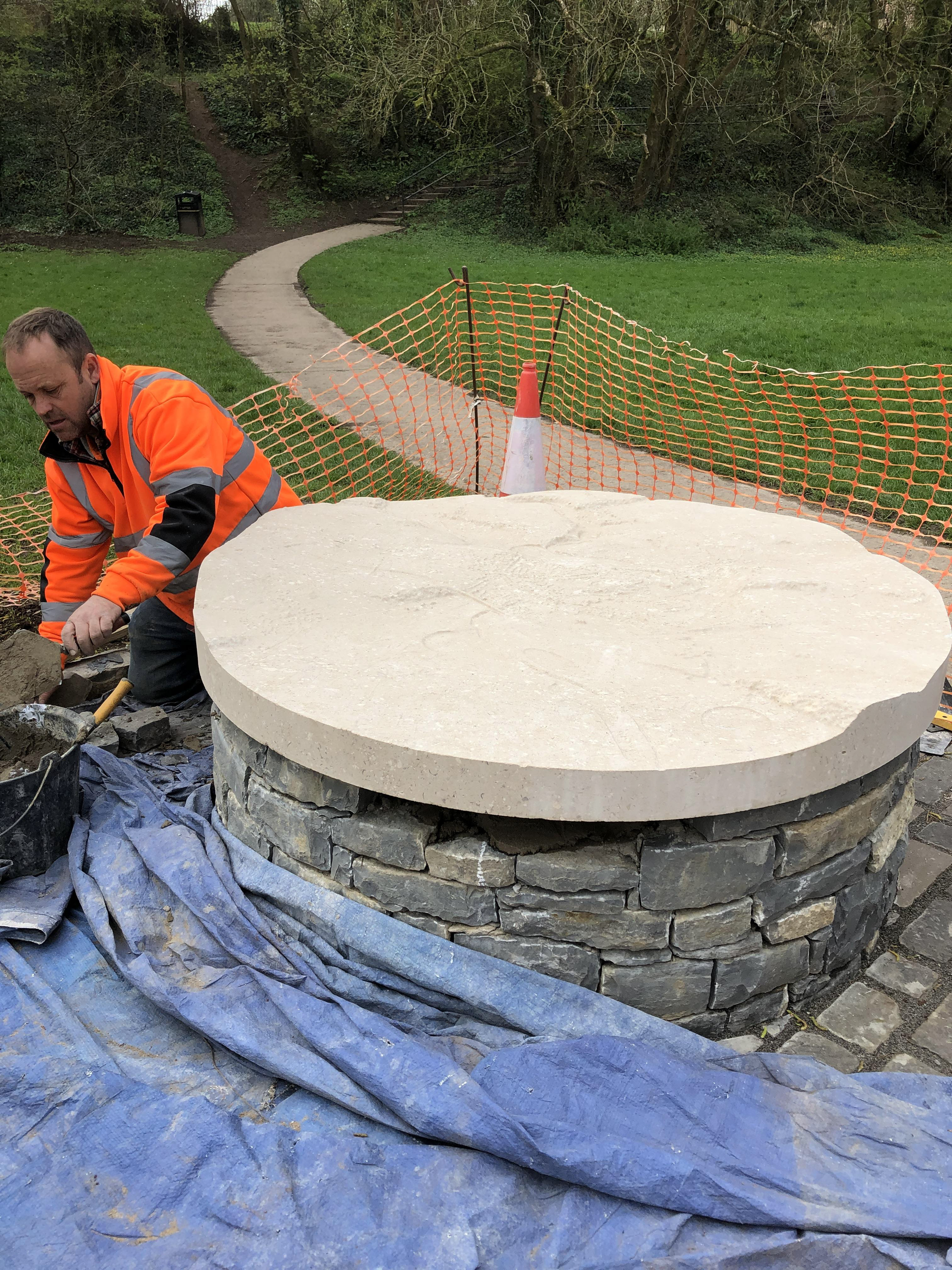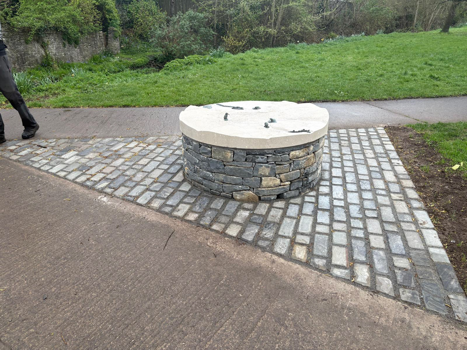 Built from local Blue lias stone the plinth , and surrounding cobbles, were constructed by fantastic stonemason Jon Wilson.
