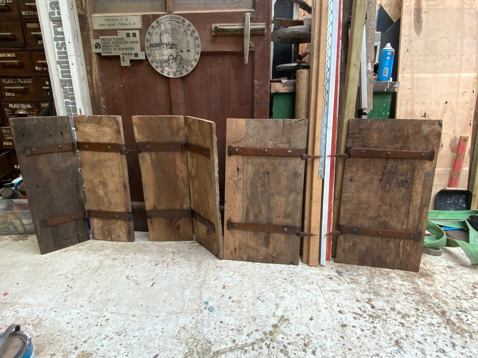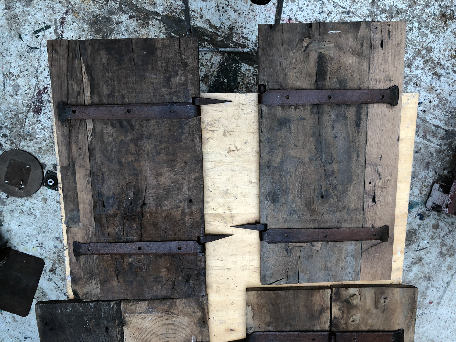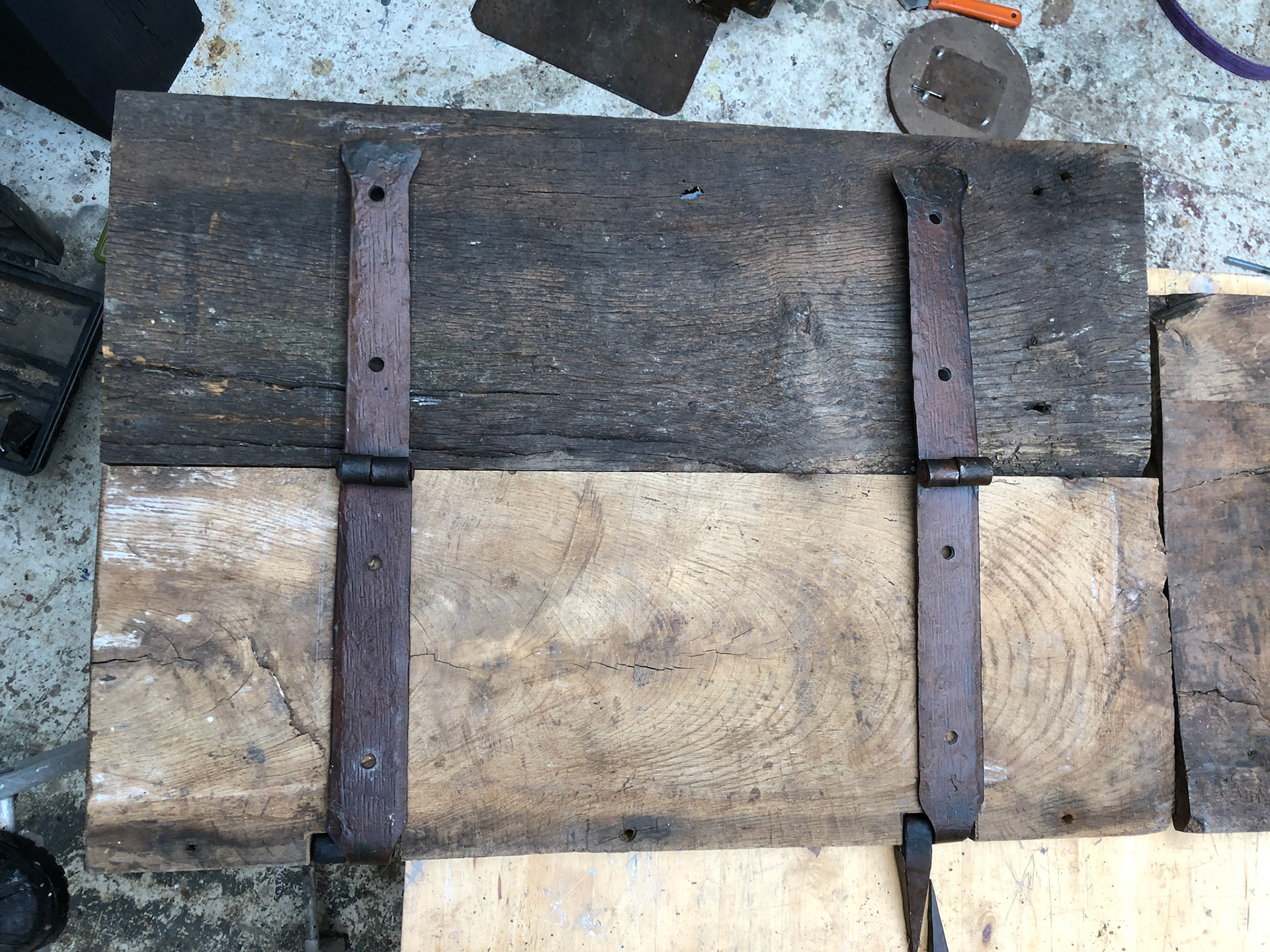 Something a little different! Commissioned by CADW for the stewards room at Tretower court this door, pair of shutters and partition were produced from reclaimed oak boards with bespoke hinges forged by Glen Adams of Horizon forge. Installed Feb 2024